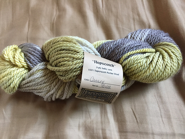 I visited the Houndstooth Fiber Arts booth and came home with the above skein of their HopScotch base in Canary. It's a merino bulky yarn that I found in the clearance bin (WUT?!).