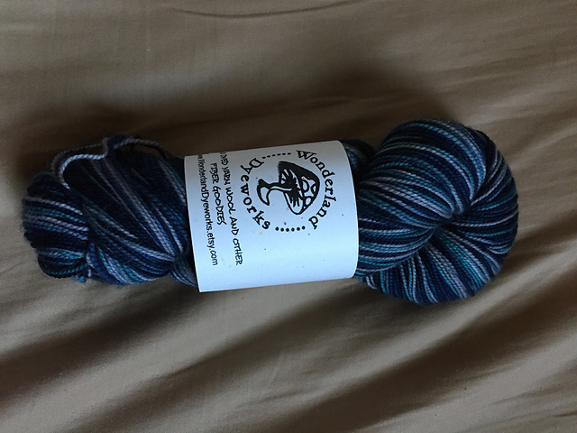 Normally, I pick up fiber from Wonderland Dyeworks but this time around, I picked up a skein of yarn. This is on their sock base, which is an 80/20 merino nylon blend in a colorway called "Star Gazer."