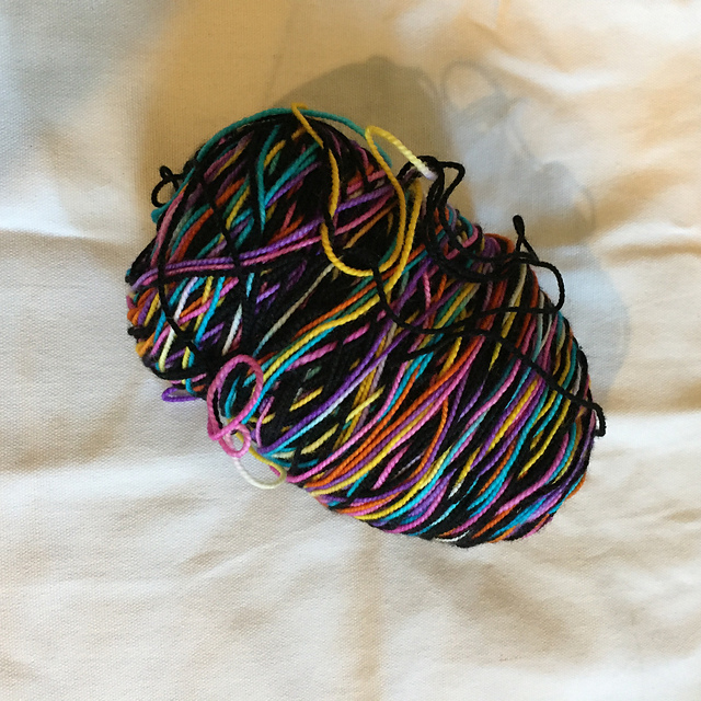 I picked up this skein of Canon Hand Dyes Charles Sock Self-Stripe already wound into a ball (I'll probably rewind it at some point), with the ball band missing. The colorway is Happy Hunger Games.