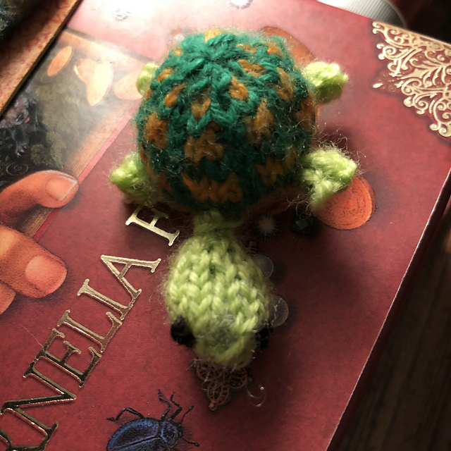 The turtle came as a kit that I bought at Imagiknit in San Francisco in November 2017. I picked up three kits that day for mini mochis: tiny narwhals, tiny turtles, and tiny frogs with a lily pad. I've made the narwhals and, now, one of the turtles. I still have enough yarn in the kit to make another turtle and I may even do that this week. He didn't take very long. The only reason it went on time-out in November was because I managed to drop a stitch during the decreases on the top of the shell and I couldn't recover it so he was frogged. It was 100% human error on that one.